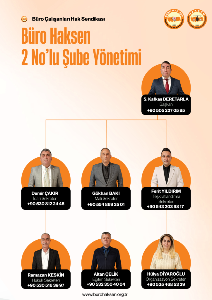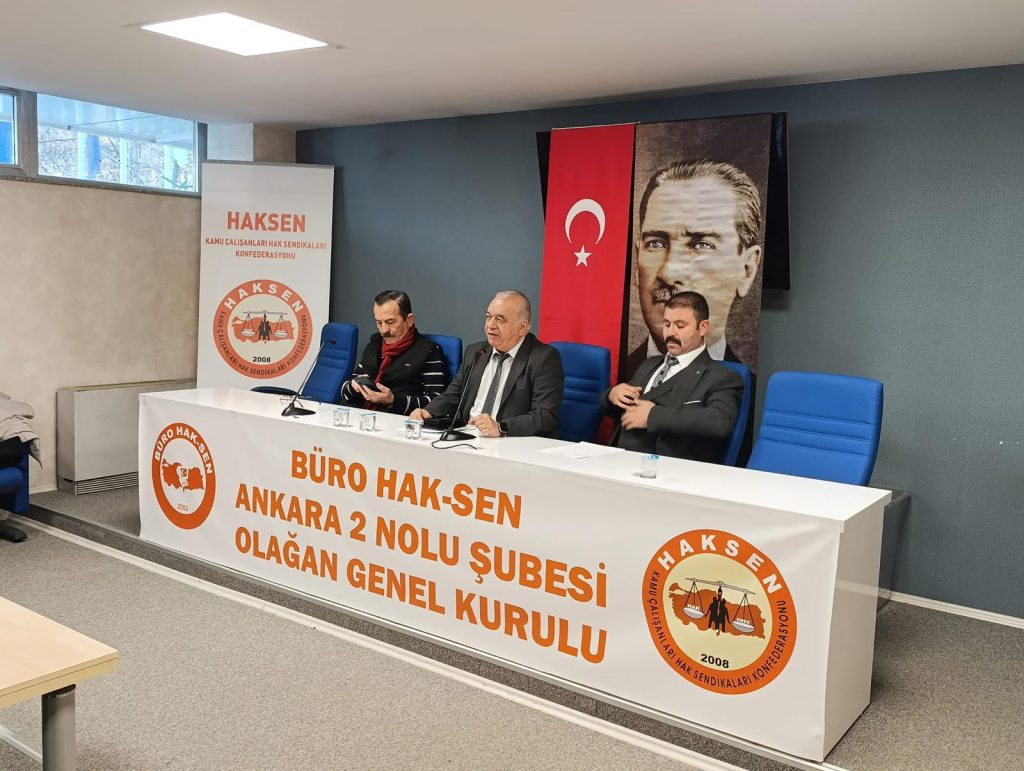 Büro Hak-Sen Ankara 2 Nolu Şubesi Genel Kurulu 20 Aralık 2025 Cumartesi günü gerçekleşti. Genel kurulumuza konfederasyon ve sendikalarımızın yöneticileriyle, delegeler ve üyelerimiz katıldı. Divan Başkanlığını İsmet Taş, Başkan Vekilliğini Köksal Kızılcı , Katip Üyeliği Emrah Kıyak’ın yaptığı genel kurulunda Haksen ve Büro Hak-Sen Genel Başkanı Ayhan Çivi’nin konuşmasının ardından katılımcılar dilek ve temennilerini paylaştılar. Konuşmacılar, hak mücadelemizde dayanışmanın önemine, birlik ve beraberliğe vurgu yaptılar. Genel kurulda şube zorunlu organların seçimi sonucunda;
